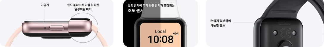 갤럭시 핏3는 18.5g의 가벼운 무게와 슬림한 디자인으로 손목에서 부담 없이 착용할 수 있습니다. 이 제품은 5ATM 방수 등급과 IP68 방진 기능을 지원하여 일상적인 물이나 먼지에 대해서 걱정 없이 사용할 수 있습니다.