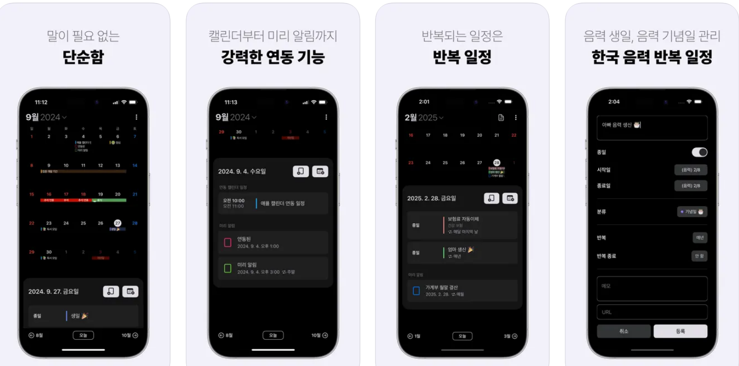 - 장점: 심플하면서도 사용자 경험을 고려한 디자인으로 시간 및 위치 기반 알림을 제공해 일정 관리가 편리합니다.