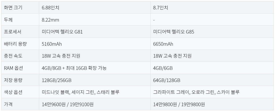 - 성능: MediaTek Helio G36 칩셋과 최대 4GB RAM, 128GB 내장 저장공간을 제공하여 일상적인 사용과 가벼운 멀티태스킹에 적합합니다. microSD 슬롯도 지원하여 저장공간을 쉽게 확장할 수 있습니다.
