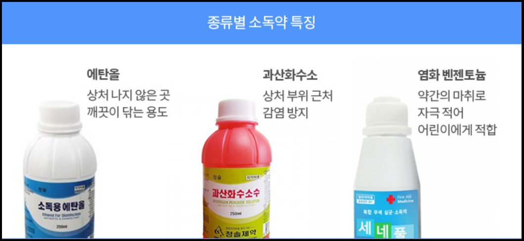 상처 소독과 살균 작용을 돕는 소독약에는 종류가 여러 가지 있습니다. 그런데 각 소독약은 사용 목적이 조금씩 다릅니다.