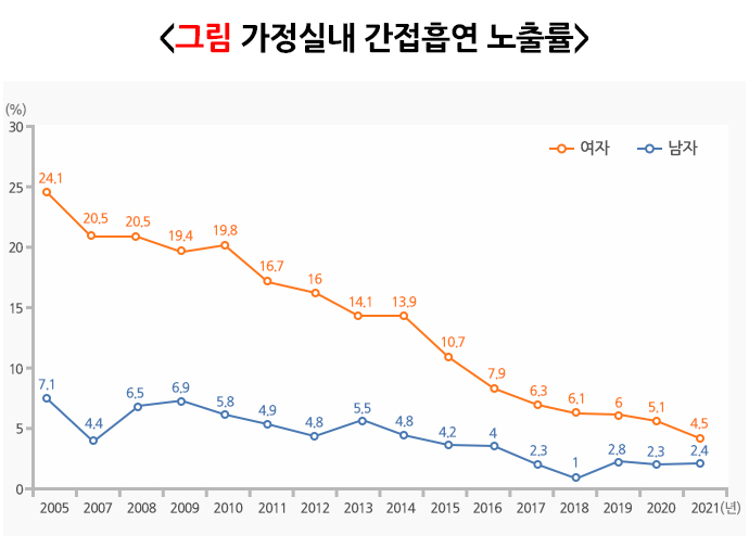 우리나라에서 비흡연자를 대상으로 가정 내 간접흡연 노출률을 조사한 결과, 2005년 이후로 여성의 노출률은 계속 감소하는 반면에 남자는 최근 3년간 큰 변동이 없었습니다. 정부의 정책적 지원과 사회적 협조를 통해 직장과 공공장소에서의 간접흡연이 많이 줄어든 것처럼 각 가정에서도 가정 내 간접흡연 노출을 줄이려는 노력이 필요합니다.