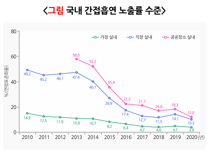 질병관리청에서 발표한 국민건강통계에 따르면, 만 19세 이상의 비흡연자들이 간접흡연에 노출되는 비율이 지속적으로 감소하는 추세를 보이고 있습니다. 2010년에 비해 가정 내의 간접흡연 노출률이 11.0% 감소하였고, 직장 내와 실내 공공장소의 간접흡연 노출률은 각각 38.9%와 46.0% 감소한 것으로 나타났습니다. 특히, 2012년부터 공공장소에서 금연구역이 확대되면서 직장과 실내 공공장소에서의 간접흡연 노출률이 더욱 뚜렷하게 감소된 것으로 생각됩니다.