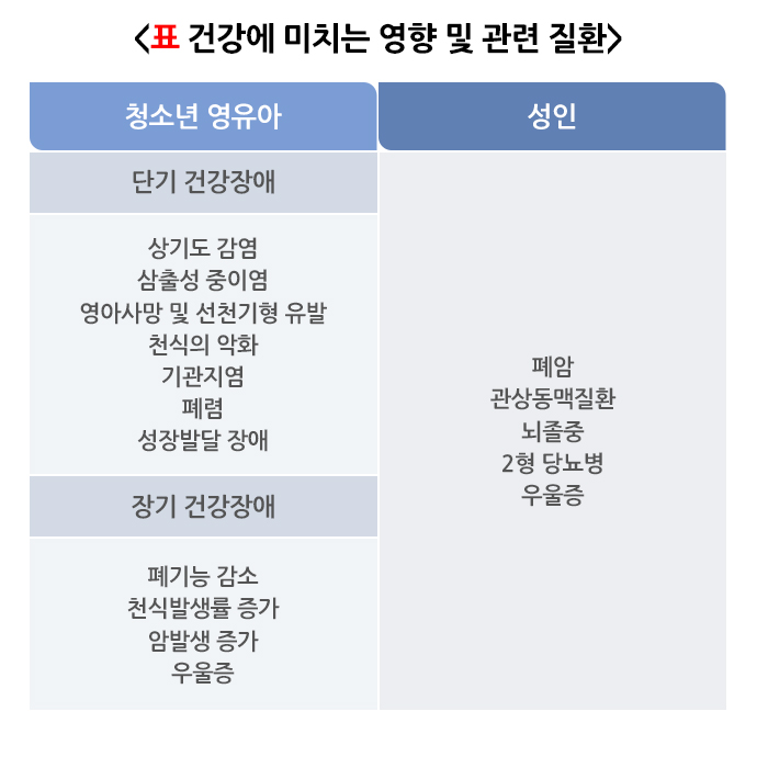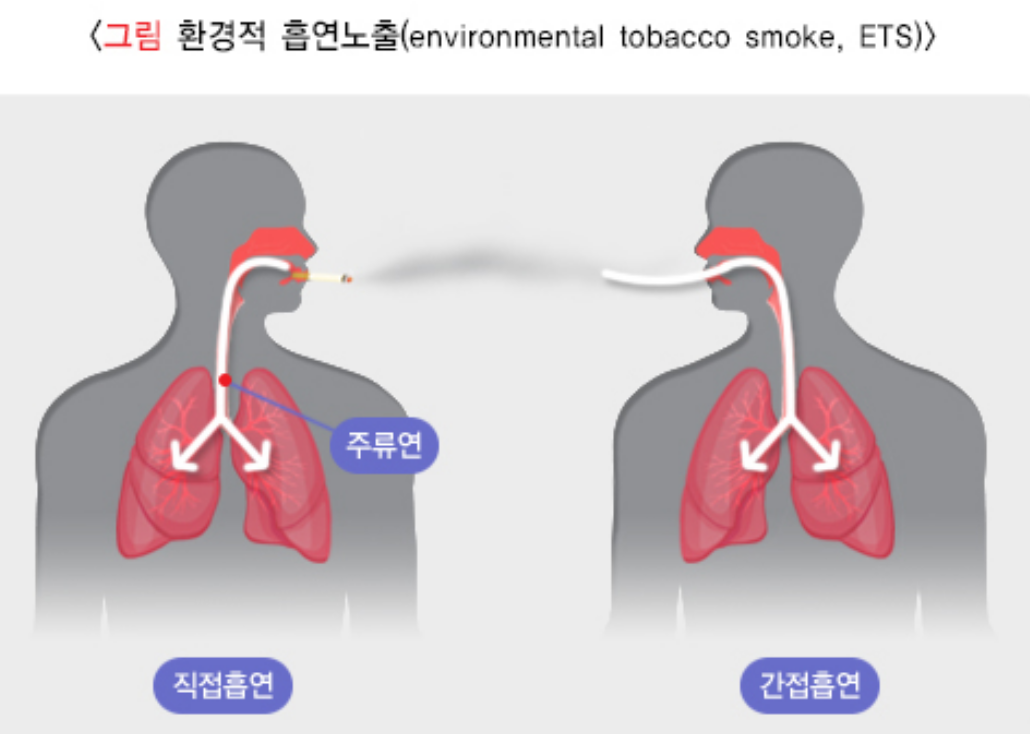 간접흡연이란 본인이 직접 담배를 피우는 것이 아니라 다른 사람이 피우는 담배 연기를 마시는 것을 말합니다. 어린이들은 천식이 악화되거나 폐렴이 발생할 수 있고, 성인들은 심뇌혈관질환이 발생하거나 악화될 수 있습니다.간접흡연으로 인한 건강 문제를 예방하기 위해서는 가정과 공공장소에서 담배 피우는 것을 금지하는 금연문화를 만드는 것이 필요하고 국가 차원에서 정책적으로 금연사업을 지원하고 확대해야 합니다.