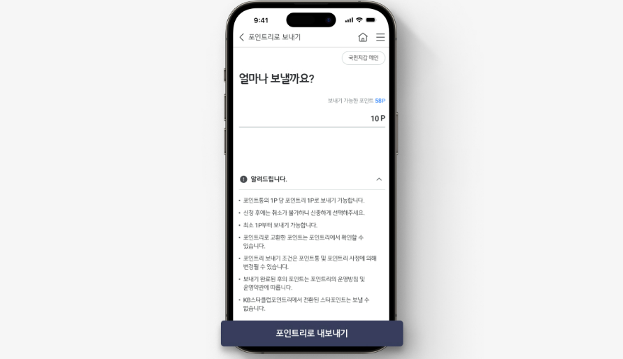 스타포인트는 KB금융그룹의 통합 포인트인 포인트리(1P=1원) 로 전환하여 더 폭넓게 사용할 수 있어요!