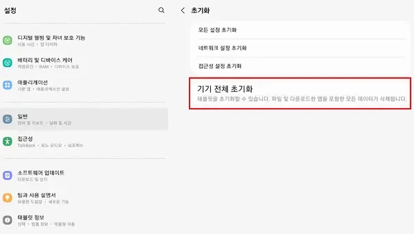 초기화 시 모든 데이터가 삭제되므로 반드시 백업을 진행해야 합니다.