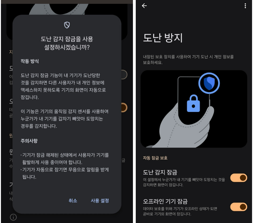 예를 들어, 도난 감지 잠금 기능을 활성화해두면, 스마트폰을 손에 들고 있을 때 누군가 갑자기 내 스마트폰을 빼앗아 달아가면 화면이 자동으로 잠깁니다. 이를 통해 불필요한 데이터 유출을 방지할 수 있습니다.