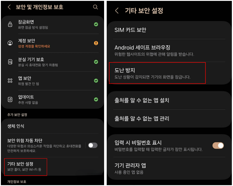 - 설정 > 보안 및 개인정보 보호 > 기타 보안 설정 > 도난 방지 메뉴로 이동합니다.
