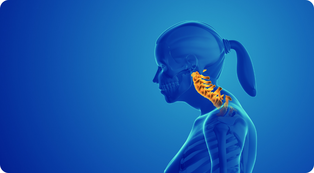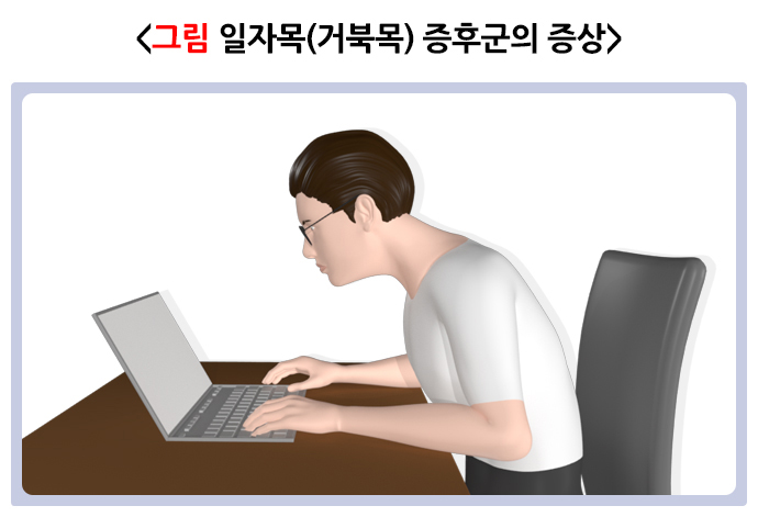 거북목 자세가 오래 지속되면 목 뼈 주변의 근육 및 인대, 디스크의 미세 손상 및 노화로 작은 외력에도 부상이 쉽게 발생하고, 통증이 쉽게 유발될 수 있습니다.