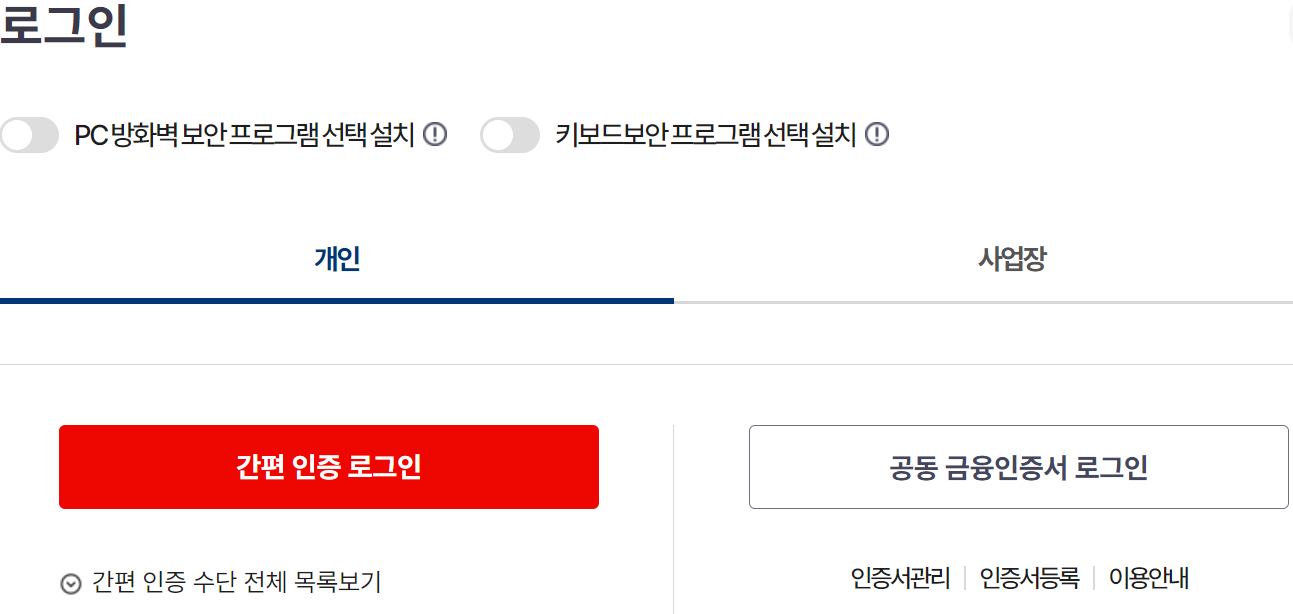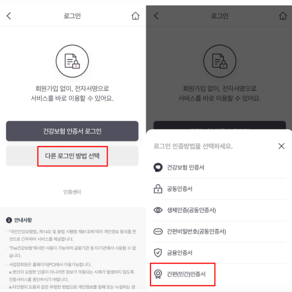 민간인증서(예: 공동인증서)나 금융인증서를 이용해 로그인합니다.