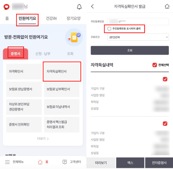 모바일을 통해 간편하게 건강보험 자격득실확인서를 발급받을 수 있습니다.