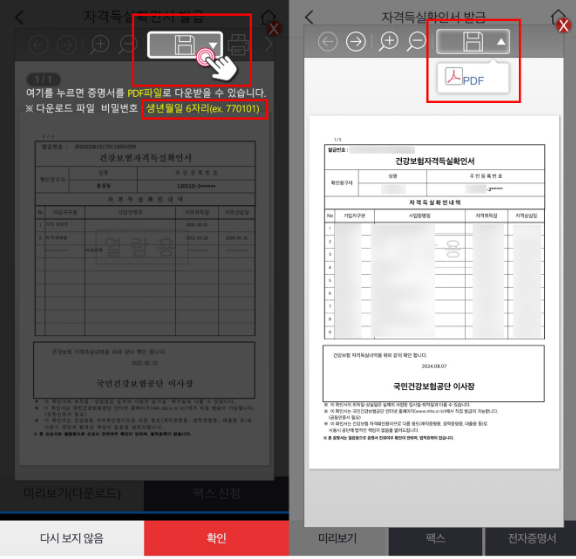 발급된 자격득실확인서를 PDF 파일로 다운로드합니다.
