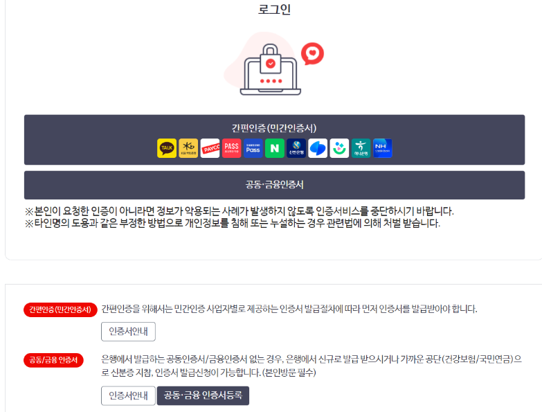 민간인증서(예: 공동인증서)나 금융인증서를 이용해 로그인합니다.