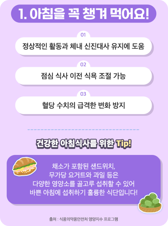 채소가 포함된 샌드위치, 무가당 요거트와 과일 등은 다양한 영양소를 골고루 섭취할 수 있어 바쁜 아침에 섭취하기 훌륭한 식단입니다!