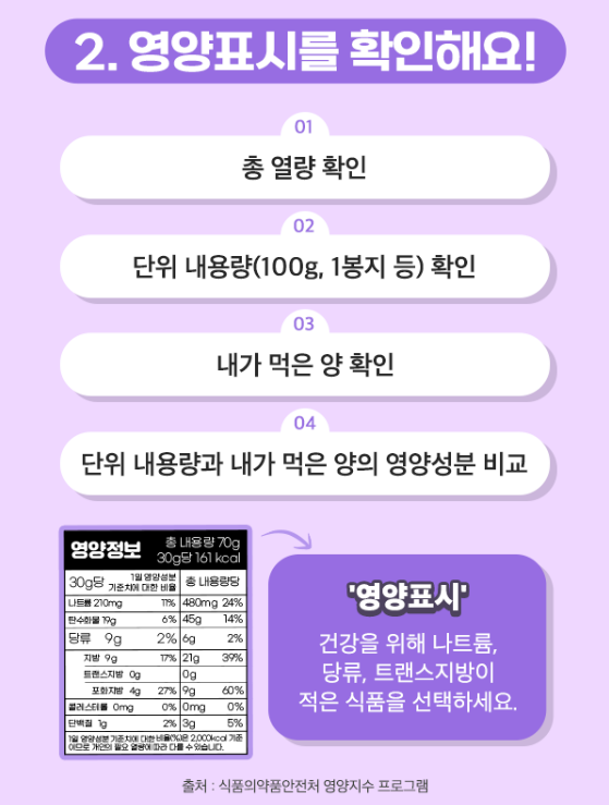 건강을 위해 나트륨, 당류, 트랜스지방이 적은 식품을 선택하세요.