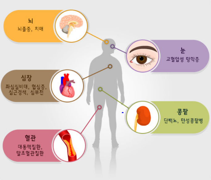 고혈압은 심장과 뇌 혈관에 심각한 영향을 미치는 주요 위험 요인입니다. 심장으로 가는 혈류가 원활하지 않을 경우, 허혈성 심질환(예: 협심증, 심근경색)이나 심부전이 발생할 수 있습니다. 또한, 뇌혈관이 막히거나 터지면서 발생하는 뇌졸중은 고혈압과 매우 밀접한 관련이 있습니다. 특히, 우리나라처럼 뇌졸중 발생률이 높은 국가에서는 고혈압 예방과 관리가 매우 중요합니다.