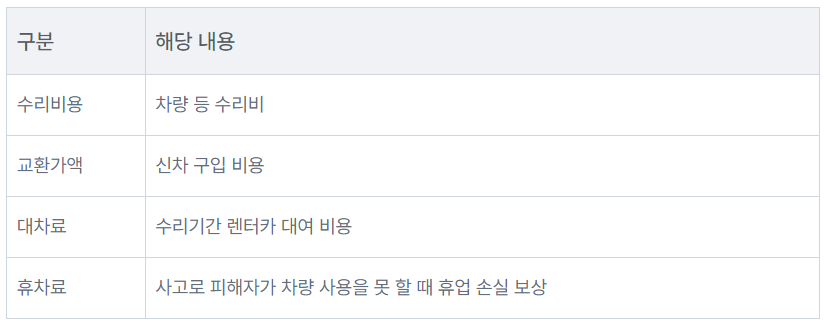 - 휴차료: 사고로 인해 차량을 사용하지 못한 기간의 손실 보상