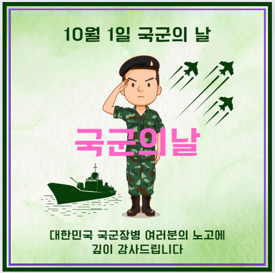 국군의 날은 군인의 헌신과 희생을 기리고, 대한민국의 안보를 책임지는 군의 역할을 재조명하는 중요한 날입니다. 역사적 배경과 다양한 논의 속에서도 국군의 날은 국민과 군이 함께하는 축제의 장으로 발전해왔습니다. 앞으로도 국군의 날이 국민의 안보 의식을 고취시키고, 군과 국민이 하나 되는 소중한 기념일로서 지속되기를 바랍니다.