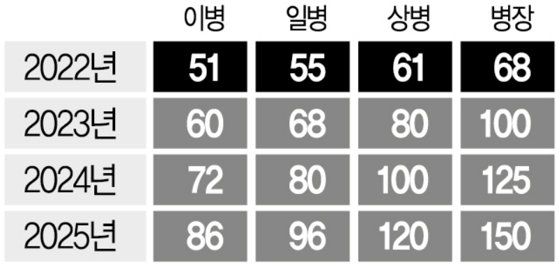- 2025년: 병장 월급 205만원 (40만원 인상)