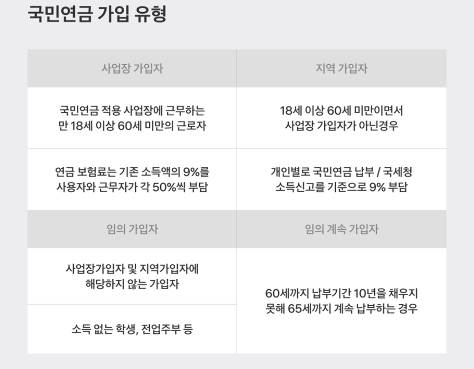 - 사업장 가입자: 사업장에서 일하는 근로자와 사업주는 소득의 9%를 나누어 납부합니다. 만 18세 이상 60세 미만 근로자는 모두 가입 대상입니다.