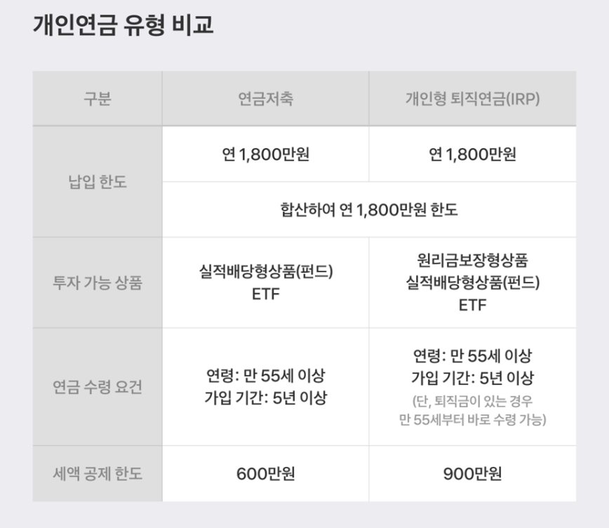 - 개인연금: 개인이 선택할 수 있는 연금저축과 개인형 IRP.
