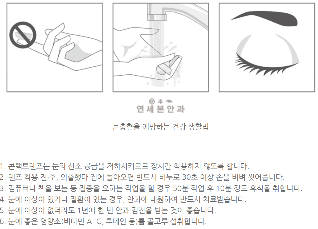 - 콘택트렌즈 착용으로 인한 충혈은 렌즈 착용을 중단하고 휴식을 취해야 합니다.
