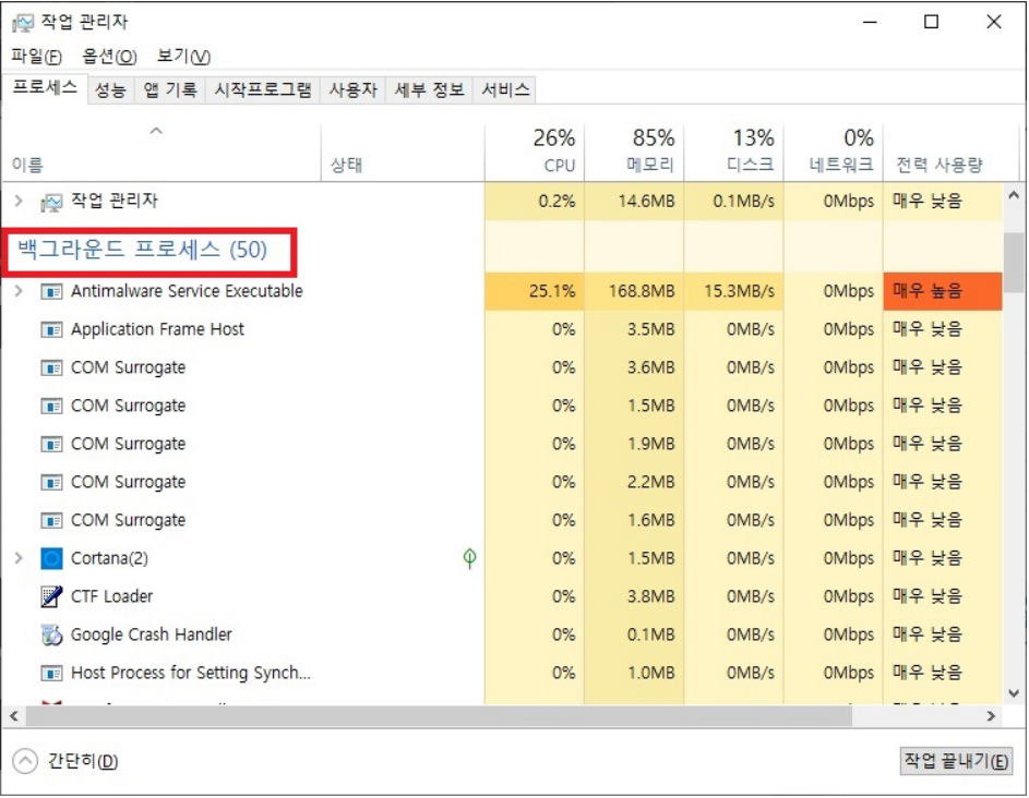 ✅ Ctrl + Shift + Esc 로 작업 관리자 실행 후 리소스 과다 사용 프로세스 종료