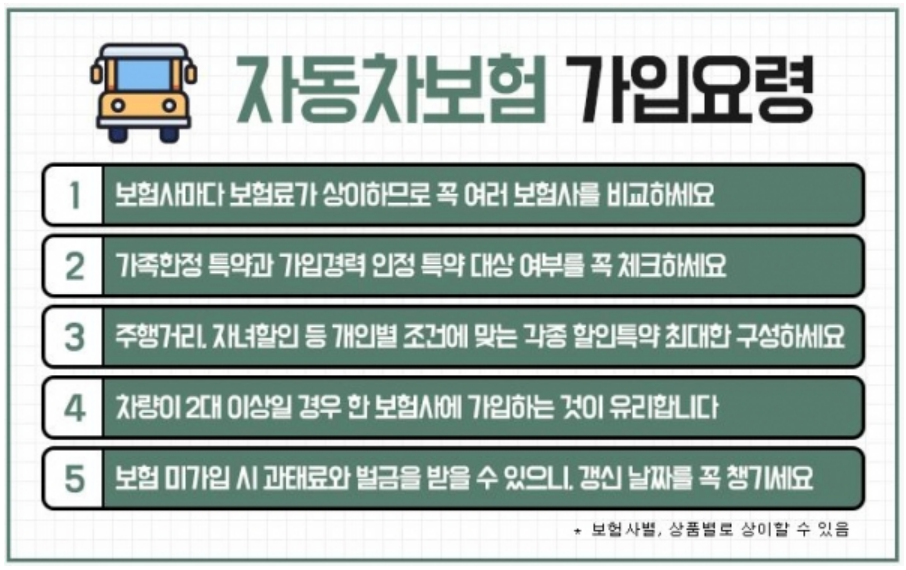가입 시에는 다양한 할인 혜택을 놓치지 않도록 주의하고, 보장 항목과 약관을 꼼꼼히 확인한 뒤 가입하세요. 자동차보험을 현명하게 가입하여, 더 저렴하고 안전하게 차량을 운행하세요!