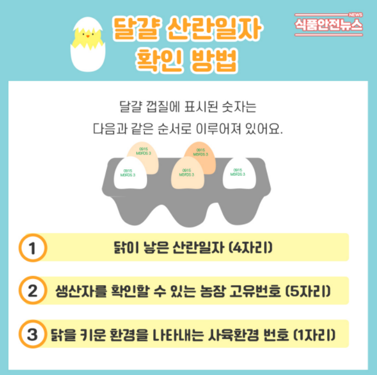 - 농장 고유번호: 달걀이 생산된 농장을 식별할 수 있는 고유번호입니다. 이 번호는 5자리로 표시되며, 해당 번호를 통해 달걀의 생산지를 확인할 수 있습니다.