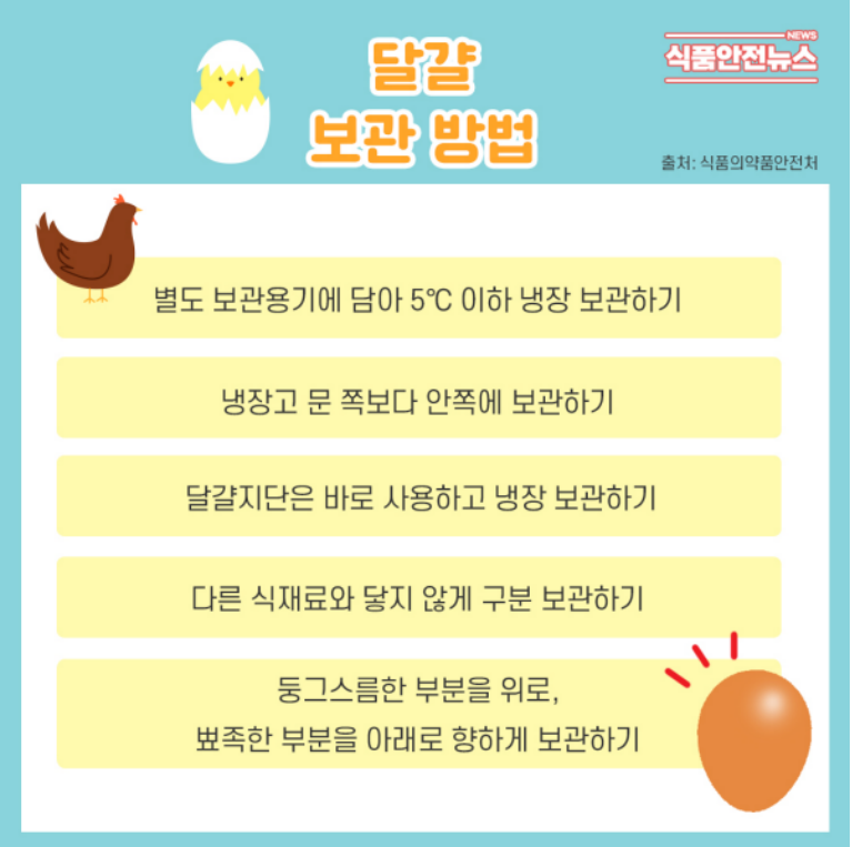- 저온 보관: 달걀은 별도의 보관 용기에 담아 5℃ 이하의 냉장고 안쪽에 보관하는 것이 좋습니다. 냉장고 문 쪽에 보관하면 온도 변화로 인해 신선도가 떨어질 수 있습니다.