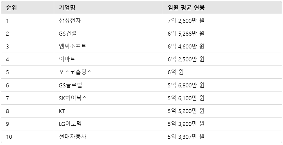 이 기업들은 주로 정유, 금융, 통신 등 고부가가치 산업군에 속하며, 글로벌 시장에서도 두각을 나타내고 있습니다. 에쓰오일, SK텔레콤 등은 특히 정유와 통신 업계에서 높은 수익을 기록하면서 직원들의 평균 연봉도 높습니다.