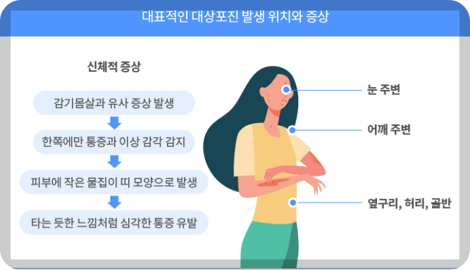 대상포진은 수두-대상포진 바이러스가 잠복상태로 있던 후 다시 활성화되어 발생하는 질환으로, 몸 한쪽 부위에 **심한 통증과 함께 특징적인 물집(수포)이 생기는 것이 특징입니다. 대부분 50세 이상의 노약자나 면역력이 약한 사람에게 발생하며, 심각한 합병증을 유발할 수도 있습니다.