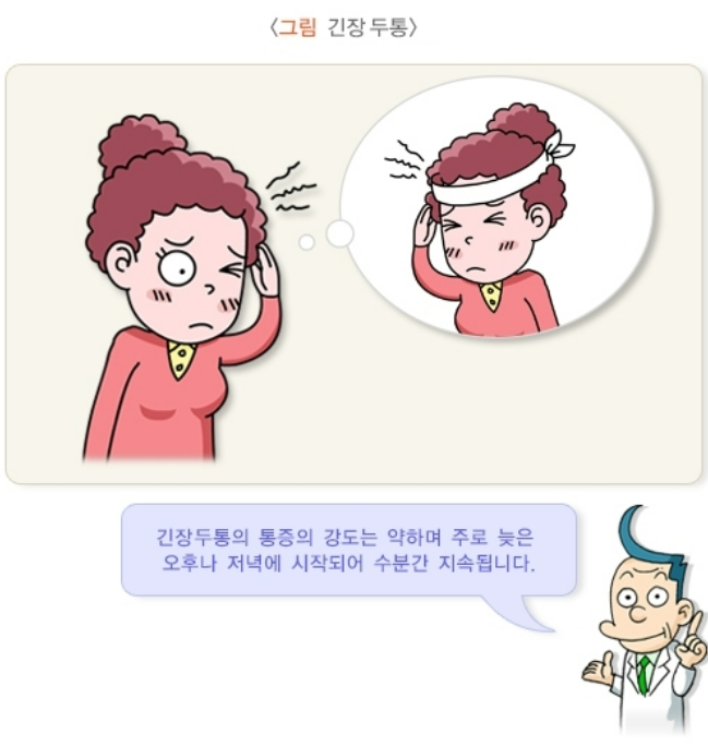 긴장두통: 증상은 머리 양측에 조이는 느낌으로 아프며 편두통이나 군발두통보다는 통증의 세기는 약함. 보통 일상 활동으로 악화하지는 않고, 증상의 지속시간은 다양하지만 늦은 오후나 저녁에 시작되어 수 분간 지속하는 경우가 많습니다.