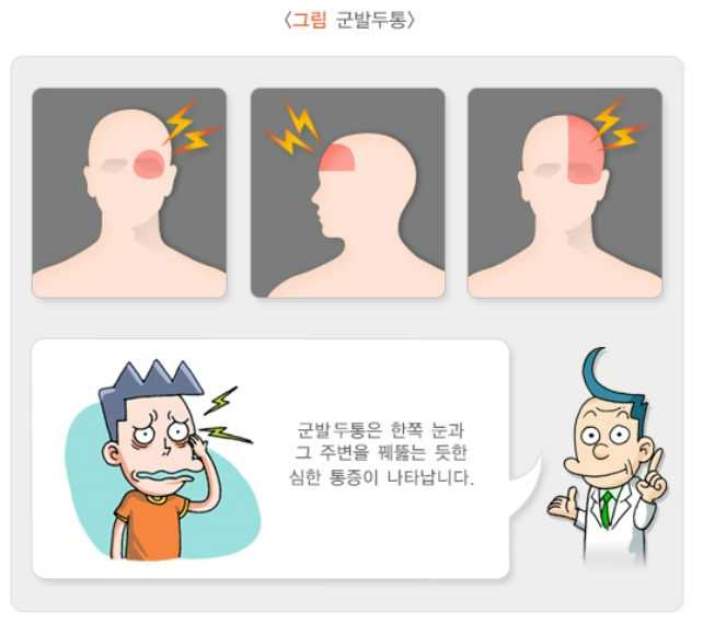 군발두통: 눈 주변, 눈 위, 얼굴의 옆면에 심한 통증이 나타나며, 통증의 양상은 날카롭거나 도려내는 듯한 느낌, 따끔거림, 욱신거림, 조이는 느낌 등 다양합니다. 또한 두통이 있는 쪽 얼굴에 눈 충혈, 눈물, 콧물/코막힘, 땀, 눈꺼풀 부종/처짐 등 다양한 증상이 잘 동반됩니다. 두통은 한번 시작되면 15~180분 지속되며, 한번 시작되면 몇 주나 몇 개월 동안 이틀에 한 번~하루 8번까지 반복되게 됩니다.