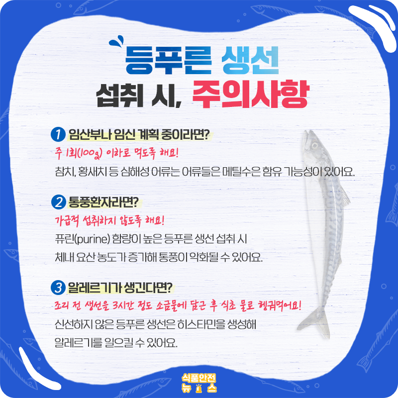 - 임신 중인 여성은 주1회에 100g 이하로 등푸른 생선을 섭취하는 것이 권장됩니다.