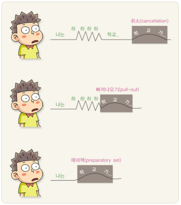 - 유창성 완성법: 말의 유창성을 높여 불안과 공포를 줄이는 방법입니다. 느리게 말하기, 부드럽게 말하기를 훈련합니다.