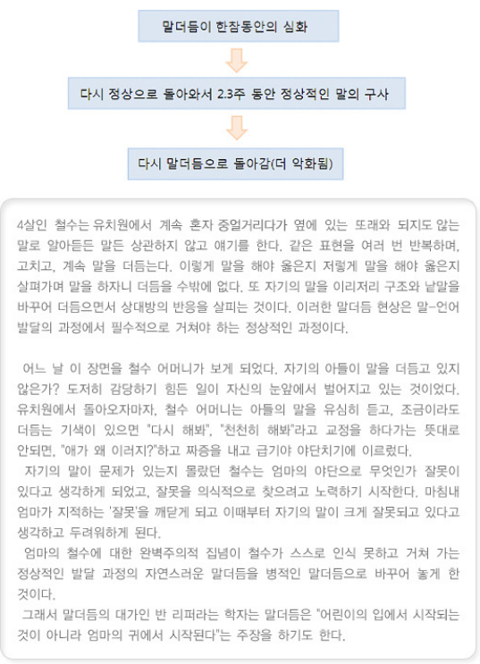 2. 말더듬은 아이가 충격을 받거나 가정불화가 있어서 생기는 심리적인 병이다.