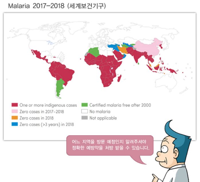 - 사용되는 예방 약물은 여행 국가, 여행 기간, 개인의 건강 상태 등에 따라 다릅니다.