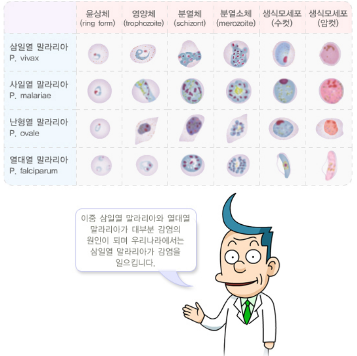 *이 외에도 드물게 발생하는 **원숭이 말라리아 (Plasmodium knowlesi)*가 있습니다.