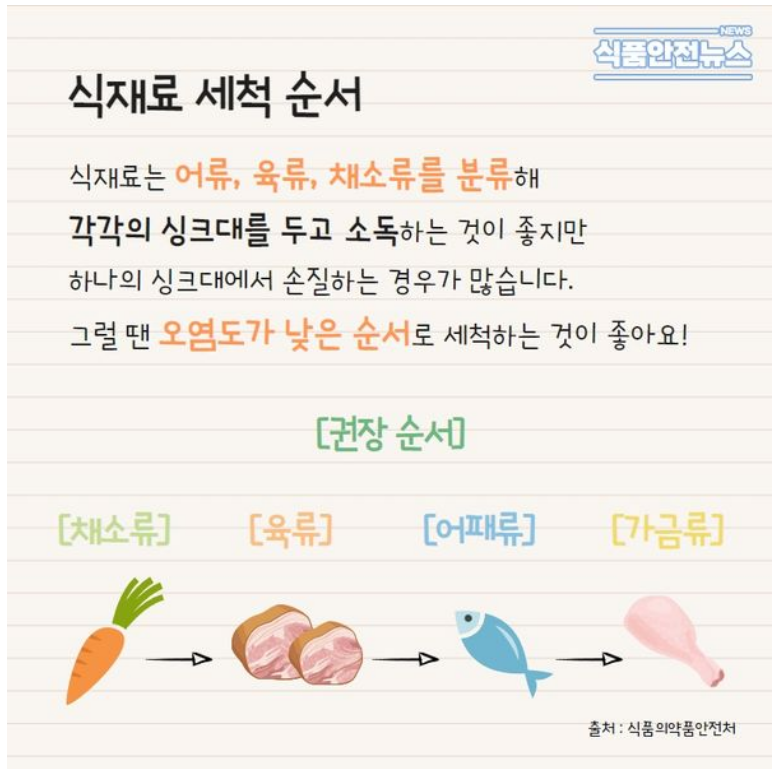 싱크대가 하나일 때는 오염도가 낮은 순서대로 세척하는 것이 좋습니다. 여러 식재료를 한꺼번에 세척해야 할 때 아래 순서를 따르면 보다 위생적으로 세척할 수 있습니다.