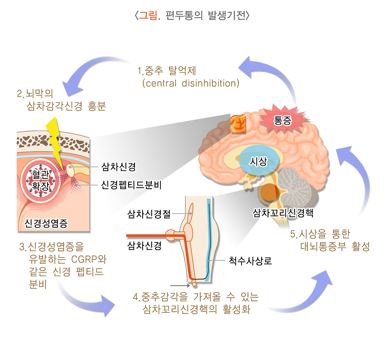 편두통이 발생하는 기전은 아직 명확하게 밝혀지지 않았습니다. 많은 연구자들은 뇌의 기능적인 변화, 신경 전달 물질 농도의 변화 및 삼차 신경과 그 주변 혈관의 염증 반응을 중요한 편두통의 발병 기전 (사진=질병관리청국가건강정보포탈)