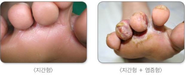 지간형: 발 백선 중 가장 흔한 형태로, 발가락 사이(특히 4~5번째 발가락 사이)에 주로 발생합니다. 피부가 희게 짓무르며 갈라지고, 건조해지면 각질이 생깁니다. 가려움증과 발 냄새를 동반할 수 있습니다.