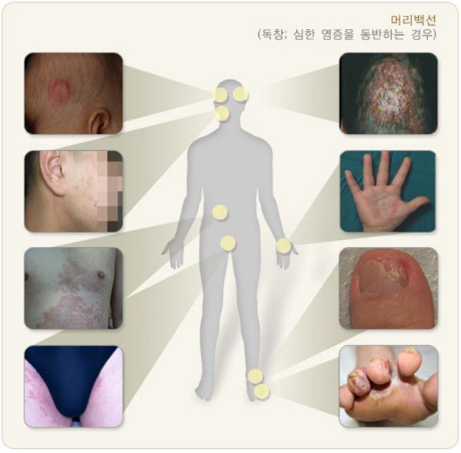 백선증은 곰팡이에 의한 대표적인 감염증으로 무좀 혹은 백선증이라고 한다. 피부 부위별로 보면 가장 흔한 곳은 발가락 무좀 혹은 발 백선증으로 주로 세, 네 번째 발가락 사이가 짓무르고 갈라지며 가려우면서 2차적인 세균감염으로 고름이나 냄새를 동반하는 경우가 많다.