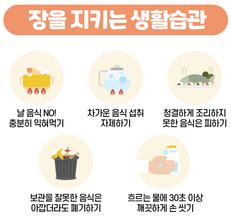 - 음식 관리: 음식을 철저히 익혀 먹고, 신선한 식재료를 사용하세요. 특히 여름철에는 냉장 보관을 철저히 하고, 유통기한이 지난 음식은 섭취하지 않도록 주의해야 합니다.