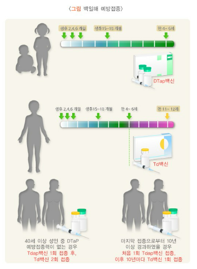 - 청소년 및 성인: 10년마다 Tdap 백신을 접종하는 것이 권장됩니다. 특히 임산부는 임신 27~36주 사이에 Tdap 백신을 접종해야 합니다.