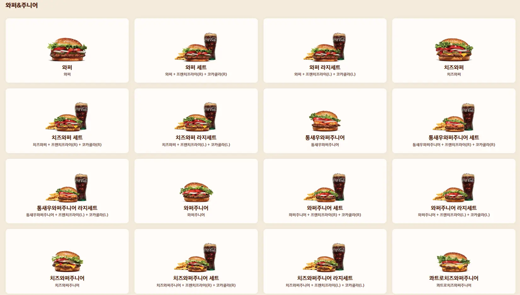 | 모든 버거 | 다양한 종류의 햄버거가 준비되어 있습니다. (예: BBQ 치킨버거, 스파이시 와퍼 등) | 맛의 다양성을 원할 때 선택하기 좋은 메뉴입니다. |