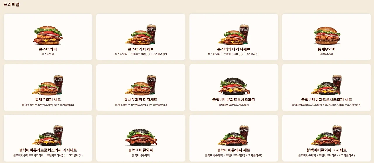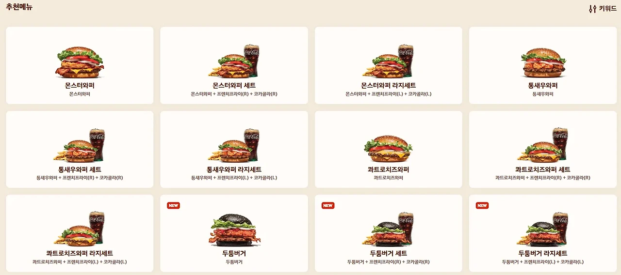 | 모든 버거 | 다양한 종류의 햄버거가 준비되어 있습니다. (예: BBQ 치킨버거, 스파이시 와퍼 등) | 맛의 다양성을 원할 때 선택하기 좋은 메뉴입니다. |