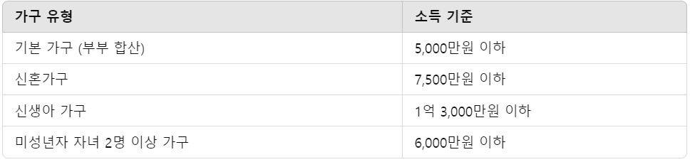 - 연 소득 기준: 부부 합산 5,000만원 이하