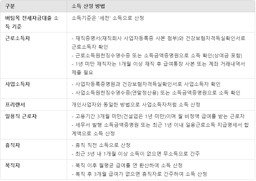 - 대출 신청자는 소득 기준도 충족해야 하며, 상품에 따라 소득 기준이 달라집니다.