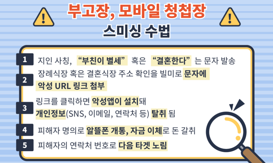 지인이나 가족을 사칭해 결혼식 청첩장이나 부고장 링크를 문자로 보내고, 이를 클릭하면 악성 앱이 설치되는 금융사기 수법입니다.