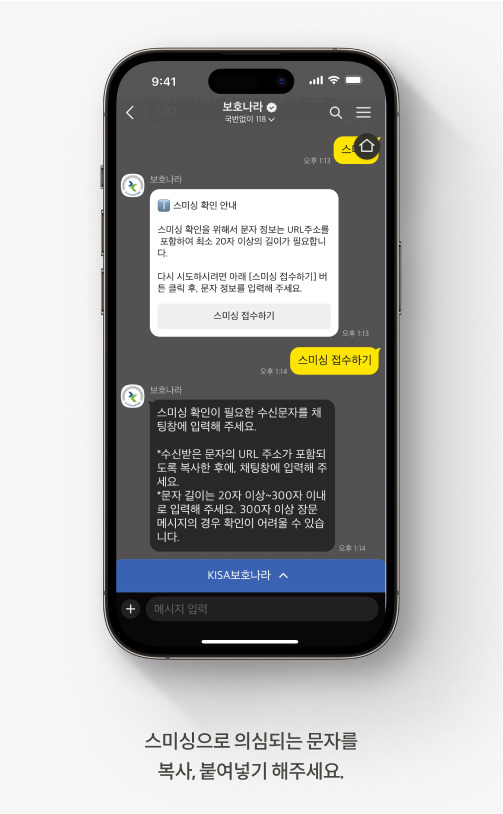 - 수상한 문자를 복사해 붙여넣기 → 스미싱 여부 확인 가능